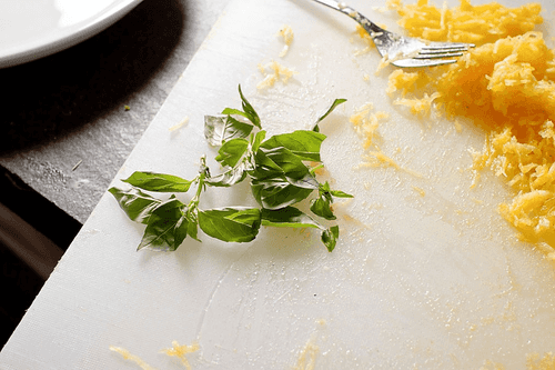 Когда сквош и помидоры прогреются, добавить к ним листочки свежего базилика (крупные листья можно нарвать руками) и горсть тертого пармезана или пекорино. Смешать овощи с сыром и подержать еще несколько секунд на огне.