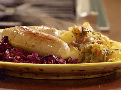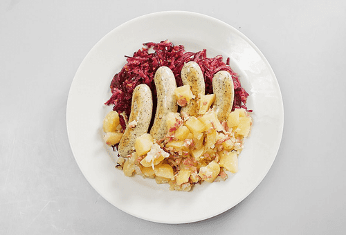 Перед подачей слегка подогреть мюнхенские колбаски. На сервировочные тарелки выложить тушеную капусту, сверху на капусту по две или четыре колбаски, а затем — картофель с беконом и луком.