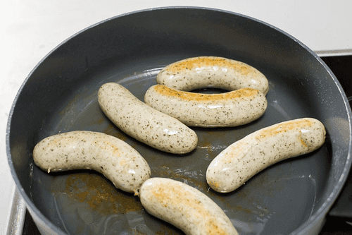 Положить колбаски в сковороду, добавить примерно четверть стакана воды, сбрызнуть маслом. Довести воду до кипения, уменьшить огонь и готовить колбаски, пока вода полностью не испарится. За это время они должны будут приобрести легкий золотистый оттенок. Снять сковороду с огня и отставить.