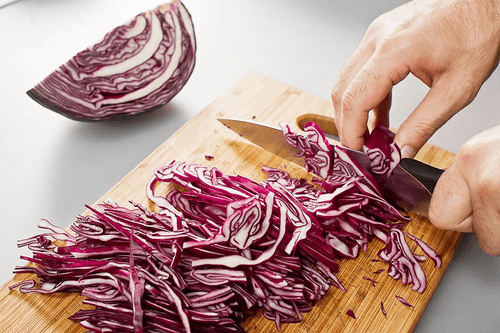 Влить к капусте сидр, потушить еще тридцать секунд, вмешать горчицу и выключить огонь. Удалить лавровый лист. Готовую капусту накрыть крышкой и отставить на время. Затем измельчить репчатый лук и бекон.