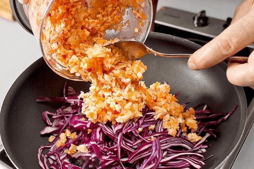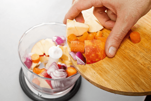Очистить морковь, красный лук и яблоко. Нарезать некрупными кусочками и сложить в чашу кухонного комбайна. Измельчить овощи вместе с яблоком в пульсовом режиме, не превращая смесь в кашу.