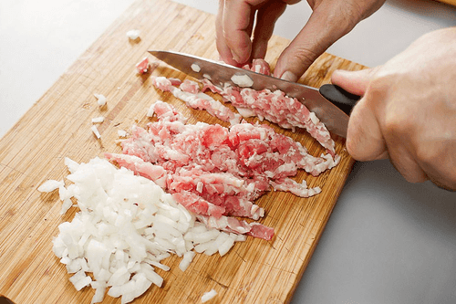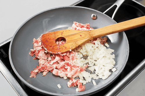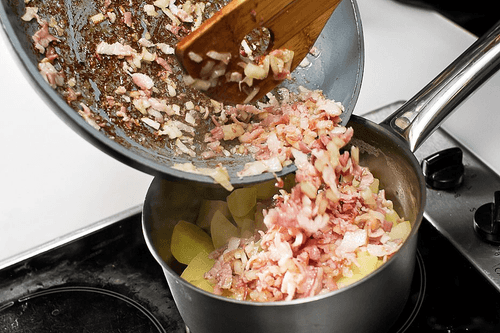 Разогреть неглубокую сковороду на среднем огне и обжарить на ней сначала бекон в течение двух-трех минут, а затем к нему добавить лук — и жарить все вместе еще в течение пяти минут.