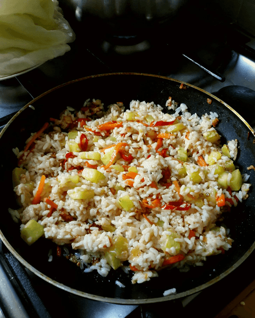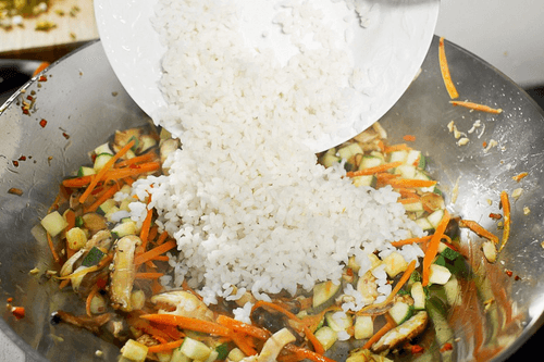Добавить к овощам холодный рис, снова все перемешать и как следует прогреть смесь в течение одной-двух минут, но не дольше, иначе рис превратится в чипсы.