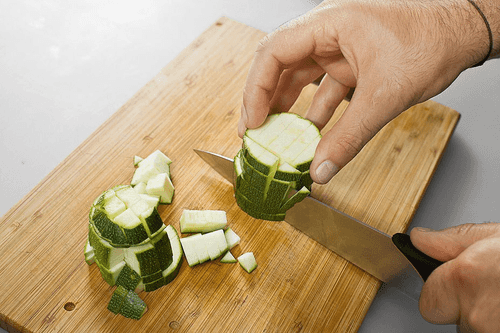 Нарезать цукини небольшими кубиками, мелко порубить лук и чеснок. Свежий имбирь очистить от кожицы и натереть на мелкой терке. Зеленый лук измельчить, пересыпать в сухую миску и отставить на время.
