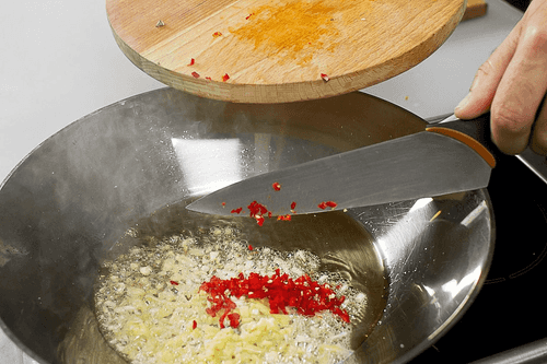 Хорошо прогреть вок, влить четверть стакана кунжутного масла. Бросить в горячее масло чеснок, имбирь и мелко нарезанный перец чили. Жарить одну минуту.
