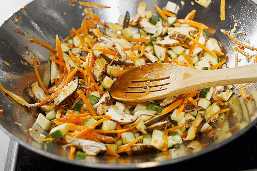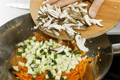 Добавить морковь, жарить еще минуту. Затем к получившейся ароматной смеси добавить цукини и грибы, непрерывно при этом помешивая.