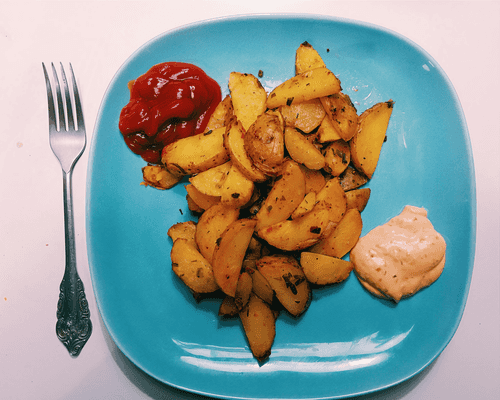 Смешать оливковое масло с мелко порезанной зеленью, соусом и продавленным через чеснокодавилку чесноком. Выложить картофель на противень в один слой, предварительно обмакнув дольки в получившуюся смесь.