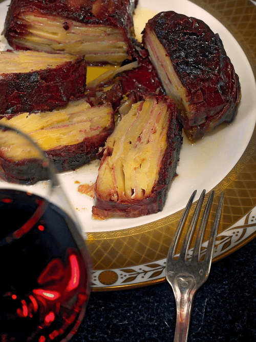 Картофельный мильфей — изысканное блюдо французской кухни, сочетающее нежность картофеля, аромат копченого бекона и насыщенный вкус грюйера. Идея многослойности пришла из классической французской кондитерской, где «мильфей» означает «тысяча слоев». Здесь вместо слоеного теста используется картофель, создавая гармоничное сочетание текстур и вкусов. Этот пирог запекается до золотистости, пропитываясь сливочным маслом и копченым ароматом бекона. Его подают как самостоятельное блюдо или как гарнир к мясу, а нежные ломтики раскрывают всю глубину вкусового ансамбля. Картофельный мильфей — это идеальный пример французской гастрономии, где простые ингредиенты превращаются в кулинарный шедевр.