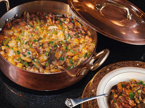 Отправить заправку к фасоли. Еще минут двадцать потушить косидо на слабом огне, добавив, если нужно, воды и соли. Перед подачей посыпать нарезанными листьями петрушки.