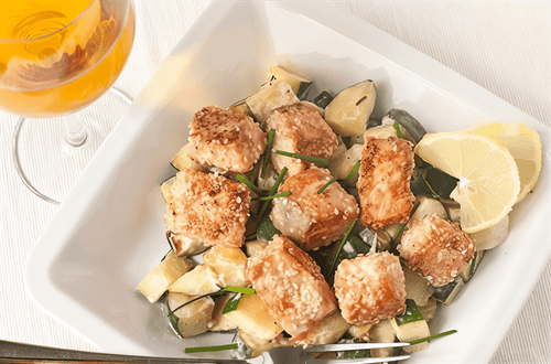 Лосось в кунжуте с цукини и лимонной цедрой — это изысканное блюдо, которое сочетает в себе утонченность итальянской кухни и простоту приготовления. Его происхождение связано с традицией средиземноморской гастрономии, где свежие морепродукты дополняются легкими, ароматными ингредиентами. Хрустящая кунжутная корочка добавляет богатый ореховый оттенок к нежному лососю, а цукини в сливочном соусе с лимонной цедрой создаёт освежающий контраст. Вкус блюда идеально сбалансирован: легкая кислинка лимона подчеркивает сладость рыбы, а сливки смягчают структуру цукини, делая его более бархатистым. Подача на тарелке выглядит элегантно, а само блюдо прекрасно подходит как для повседневного ужина, так и для торжественных случаев, когда хочется насладиться гармонией вкусов и ароматов.