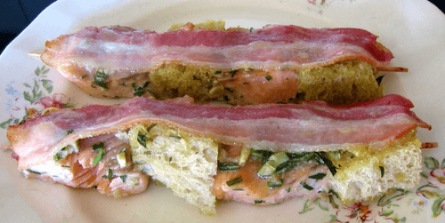 Застелить противень бумагой для выпечки, уложить на него шашлычки из рыбы и хлеба, сверху положить кусочки бекона, сбрызнуть оставшейся заправкой из оливкового масла и розмарина.