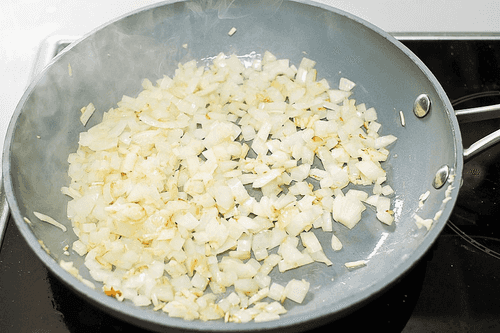 Лук и чеснок очистить и измельчить. Обжарить на растительном масле до золотистого цвета. Листья свежего базилика мелко нарезать и сложить в не большую миску.