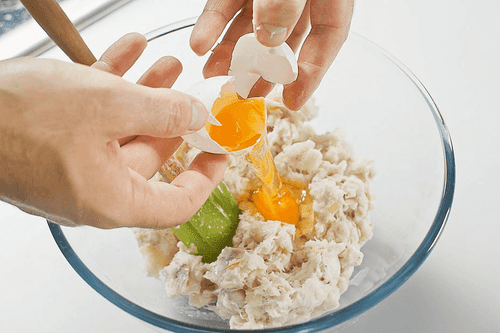 Примерно четверть объема получившегося фарша в отдельной миске смешать с измельченным базиликом и одним яйцом. Остальной фарш переложить в другую миску и также тщательно смешать со вторым яйцом.