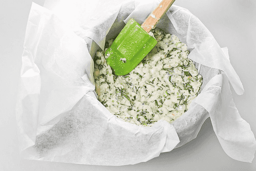 Нарезать копченого лосося небольшими кусочками. Подготовить керамическую форму для выпекания: выстлать дно и стенки пекарской бумагой.
