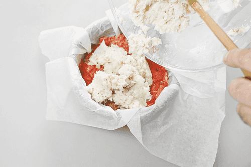 Выложить в форму первым слоем половину фарша с треской и яйцом. Сверху полностью выложить фарш с базиликом. Следом — всего нарезанного кусочками лосося.