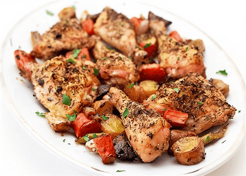 Запеченная курица с овощами и прованскими травами – изысканное блюдо французской кухни, которое сочетает в себе простоту приготовления и богатый аромат. Этот рецепт восходит к традициям юга Франции, где свежие овощи и ароматные травы играют ключевую роль в гастрономии. Запеченные с оливковым маслом и бальзамическим уксусом, овощи приобретают глубокий карамельный вкус, а куриные бедра становятся нежными и сочными. Прованские травы придают блюду тонкую, травянистую пряность, превращая его в настоящее кулинарное удовольствие. Подается с яркими листьями свежей петрушки, что добавляет свежести и визуальной привлекательности. Это идеальное угощение для уютного семейного ужина, подчеркивающее гармонию простых ингредиентов и утонченных ароматов французской кухни.