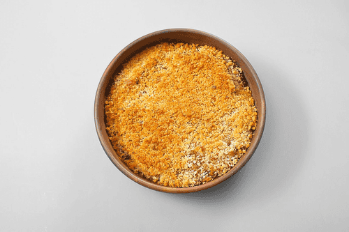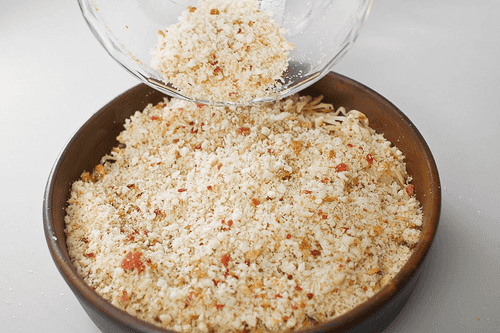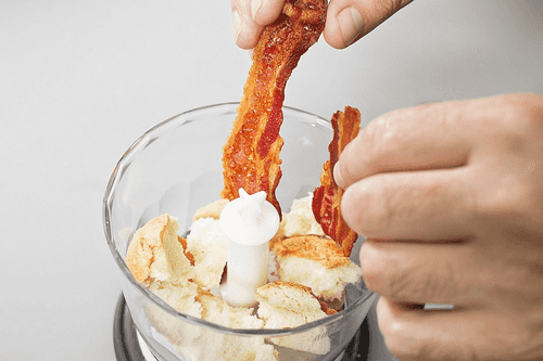 Ломтики бекона подсушить в духовке до хрустящего состояния, переложить на салфетку, дать впитаться лишнему жиру, охладить. В чашу кухонного комбайна добавить черствый хлеб, сливочное масло, бекон и измельчить в крошку.