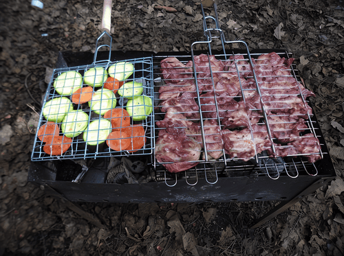 Замаринованные кусочки обжаривать на решетке для барбекю до коричнево-красной корочки.