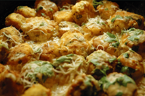 Вынуть форму с запекаемыми шариками из духовки, полить заливкой каждый шарик и вновь поставить в духовку еще на 15–20 минут. Сыр расплавится и потечет, а сливки пропитают шарики, сделав их особенно сочными — нас получится прекрасное блюдо для праздничного или ежедневного стола.