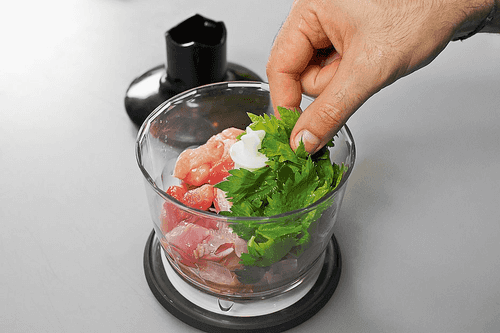 Филе кролика нарезать небольшими кусочками и сложить в чашу блендера, добавить зелень сельдерея и листья петрушки и пробить 3–4 раза на пульсовом режиме до консистенции рубленого фарша.