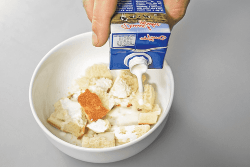 Кусок белого черствого хлеба поломать руками, сложить в небольшую миску и залить нежирными сливками. Оставить на четыре-пять минут.