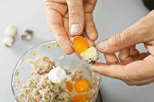 Добавить к фаршу из кролика свежие перепелиные яйца и снова пробить 3–4 раза на пульсовом режиме. Постепенно фарш будет становиться все более однородным и нежным.