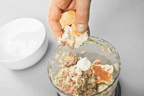 Размоченный в сливках хлеб слегка отжать (оставшиеся сливки можно будет добавить в фарш в самом конце, если он получится слишком плотным), добавить в блендер и взбить в очередной раз.