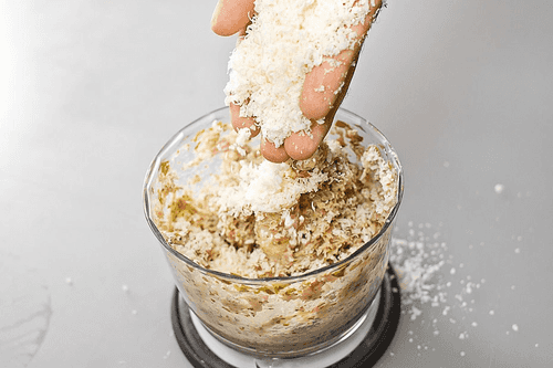 Пармезан натереть на мелкой терке и добавить в чашу блендера. Слегка посолить и поперчить по вкусу и в последний раз взбить. Консистенция готового фарша должна быть однородной и воздушной.