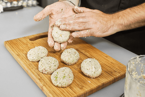 Слепить из получившегося фарша одинаковые котлеты. Чтобы фарш слишком сильно не лип к рукам, их можно периодически смачивать теплой водой.