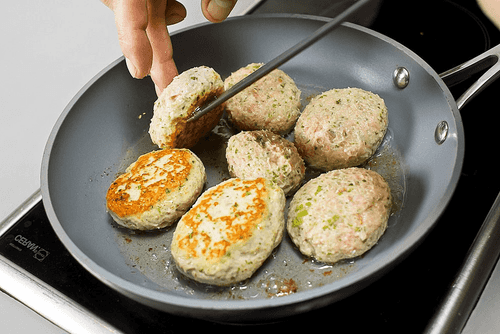 В небольшой сковороде разогреть оливковое масло и на среднем огне поджарить котлеты с обеих сторон до появления красивой румяной корочки.