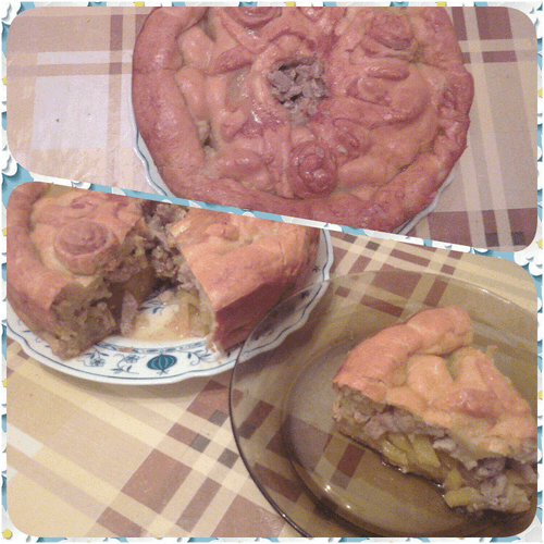 Закладываем начинку. Сначала картошку, сверху — мясо. Раскатываем оставшееся тесто, диаметр круг должен быть сантиметра на 4 меньше диаметра формы. Кладем круг на начинку и начинаем запаковывать курник. Края теста, которые остались от нижнего круга, нужно соединить с маленьким кругом сверху. Можно это сделать по такому же принципу, как фигурно залепляют пельмени. Теперь очень важно — в середине верхнего круга нужно сделать дырочку примерно 1,5 сантиметра.