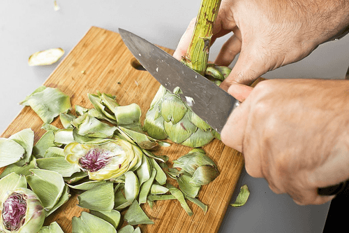 Отрезать верхушку у артишока так, чтобы его можно было плотно поставить на доску. Срезать жесткие внешние листья, затем удалить и выбросить ворсистую сердцевину и несколько внутренних лиловых листьев, отрезать стебель. Полить все срезы лимонным соком и положить в миску с холодной водой.