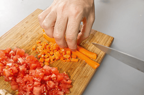 Морковь очистить и нарезать мелкими кубиками. Помидоры бланшировать в кипящей воде, затем очистить от кожицы и два из них точно так же нарезать. В самую последнюю очередь нарезать артишок. Щупальца осьминога положить в сотейник, залить водой и поставить вариться на среднем огне на двадцать — двадцать пять минут.
