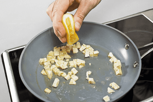 В небольшой сковороде разогреть оливковое масло, бросить кубики артишока, добавить лимонный сок (его можно выжать прямо руками из половинки лимонной дольки), перемешать и поджарить в течение пары минут.