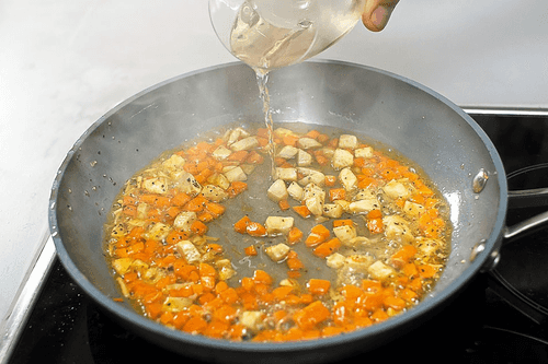 Добавить к артишоку морковь и помидоры, соль, черный перец, тимьян и измельченный чеснок, перемешать и жарить все вместе еще две минуты. Затем влить вино и на слабом огне дать жидкости выкипеть. Неплохо, если овощи сохранят форму и плотность.