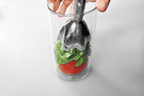 В чашу блендера положить оставшийся очищенный от кожицы помидор, добавить листья мяты (оставив несколько штук для украшения) и взбить до однородного состояния. Вареного осьминога откинуть на дуршлаг и обсушить.