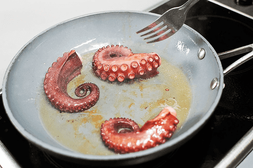 Обжарить осьминога в небольшой сковороде на оливковом масле со всех сторон в течение трех-четырех минут до появления легкого золотистого оттенка (жарить долго осьминога не стоит, иначе он станет жестким).