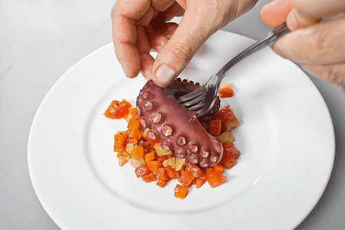На сервировочные тарелки выложить по две столовые ложки овощной смеси, сверху на каждую порцию аккуратно выложить поджаренное щупальце осьминога.