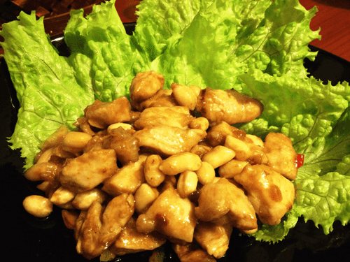 Раскалить в глубокой сковороде растительное масло, опустить в него перец горошком и, когда почувствуется аромат, вынуть. Обжарить красный перец, нарезанный квадратиками, опустить куриные кубики и залить приготовленной смесью из соевого соуса, измельченного лука, чеснока и имбиря, уксуса, сахара, коньяка и разведенного крахмала, положить сюда же обжаренный арахис, прожарить, помешивая, в течение 1 минуты и подавать к столу.