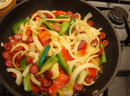 Вернуть в сковороду овощи с чоризо, перемешать и сразу подавать.
