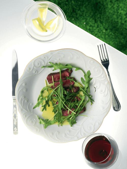 Нарезать стейк тонкими ломтиками, полить частью соуса, посолить и поперчить. Сверху разложить смешанную с соусом рукколу, посыпать пармезаном.