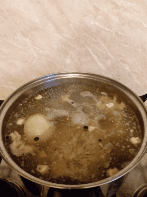 Когда содержимое бачка закипит, снимаем пену, уменьшаем огонь до минимума, чтобы только немного булькало и продолжаем варить под крышкой 8 часов. За час до готовности солим, кладем лаврушку, перец и лук. Выключаем огонь, оставляем остывать.