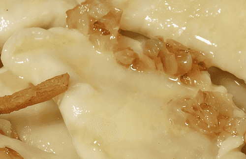 Сваренные вареники вынимайте шумовкой и кладите в миску с оставшимся сливочным маслом. Посыпьте вареники оставшимся жареным луком, а при желании и шкварками из сала. Можно есть вареники и со сметаной.