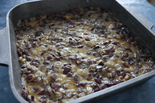 В форму, смазанную маслом, выкладываем слой риса. Затем смесь лука и желтков. Затем раскладываем половинки сосисок. Сверху выкладываем оставшийся рис. Можно смазать сверху сметаной или майонезом. Добавляем сверху тертый сыр для вкусной корочки.