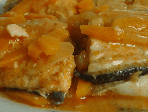 Морковь и лук шинкуем соломкой, пассеруем на растительном масле с мукой, добавляем томатную пасту, немного бульона и выкладываем сверху на горбушу.