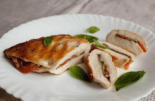 Солим и перчим грудки внутри. В серединку на каждую кладем базилик и ломтики помидора.