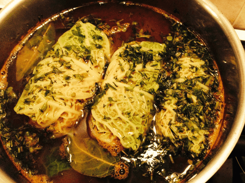 У каждого капустного листа вырезать жесткую прожилку, положить на каждый лист 1,5–2 столовые ложки начинки и аккуратно завернуть конвертиками. Сворачивание особенно хорошо получается у женщин, так что если неподалеку без дела болтается жена можно привлечь ее к этому процессу.