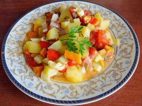 Овощное рагу из кабачков с картофелем — это простое, но удивительно вкусное блюдо русской кухни, полное аромата летних овощей. Его корни уходят в традиционные деревенские рецепты, когда хозяйки готовили из того, что было под рукой, создавая питательные и ароматные блюда. В этом рагу нежные кабачки, картофель и сочные помидоры гармонично сочетаются с луком, морковью и зеленым перцем, создавая насыщенный и слегка сладковатый вкус с легкой пикантностью чеснока и перца. Это блюдо универсально: его можно подавать как самостоятельное кушанье, как гарнир к мясу, а также употреблять в постные дни. Благодаря тушению овощи сохраняют свою мягкость и сочность, а аромат становится глубже. Это идеальный вариант для уютного семейного ужина, согревающий и насыщенный вкусами русской природы.