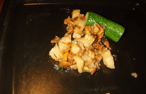В полуготовую картошку добавить лук, перемешать. Через несколько минут — лисички. Перемешать.