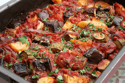 Помидоры ошпарьте кипятком и снимите кожицу. Затем также порежьте на кубики. Выложите на овощи и верните в духовку еще на 20 минут.